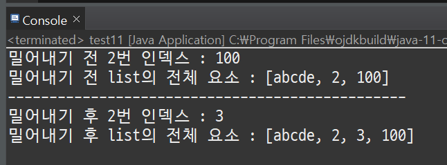 System.out.println("밀어내기 후 2번 인덱스 : " + list.get(2));