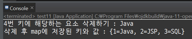 System.out.println("삭제 후 map에 저장된 키와 값 : " + map);