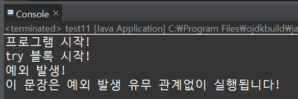 System.out.println("이 문장은 예외 발생 유무 관계없이 실행됩니다!");