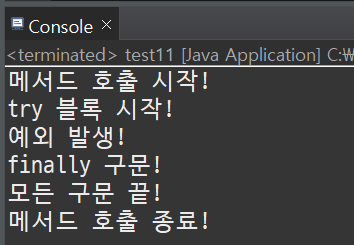 메서드 호출 => try 블록 코드 실행 => 예외 발생 => finally 구문 실행 => 프로그램 종료 => 메서드 호출 종료 이다.