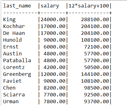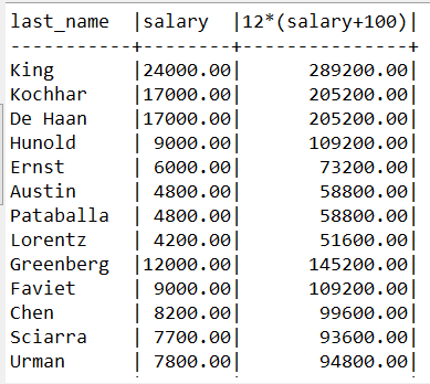 ✍ 표현식 salary+100*12은 연산자 우선순위에 의해서 + 연산보다 *의 연산이 우선 연산이 된다.