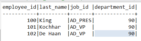 ✍ department_id 컬럼의 값이 90과 동일한 행을 출력